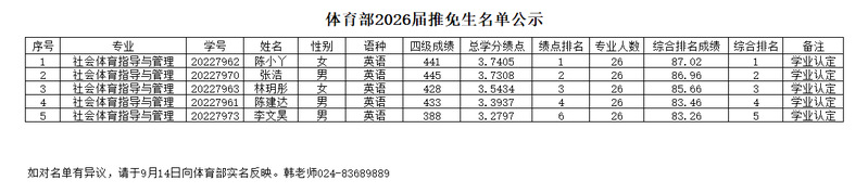 体育部2026届推免生名单公示