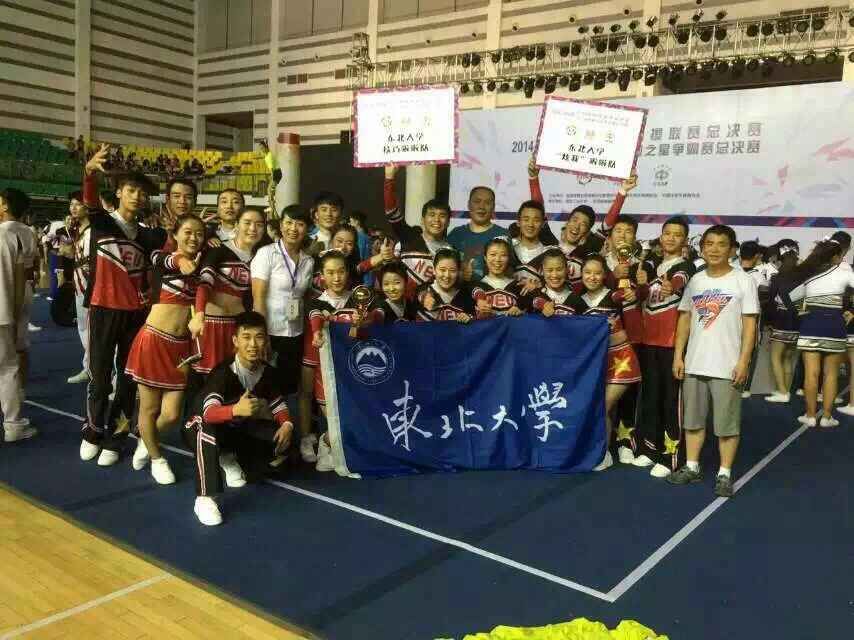 东北大学啦啦队教练团队由体育部教师姚连涛、侴丽萍、王震、李迪组成,队员由体育部、研究生院、外语学院、材冶学院学生共同组成,比赛中,队伍整体发挥稳健,队员动作整齐一致堪称完美,赢得了观众一次又一次的掌声,经过评委组讨论,东北大学啦啦队以压倒性的高分(532分和554分),独占鳌头,荣获大学组技巧3级规定动作以及大学组集体技巧(中级自选动作)的双项全国冠军。