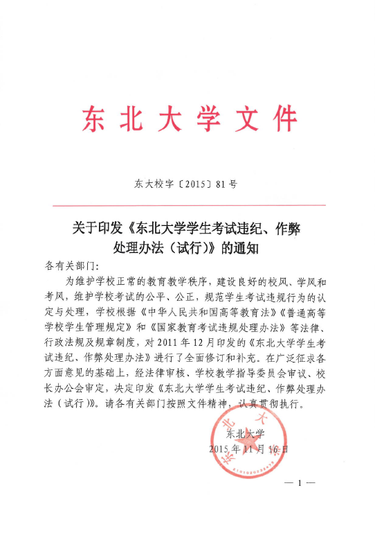 关于印发《东北大学学生考试违纪、作弊处理办法(试行)》的通知