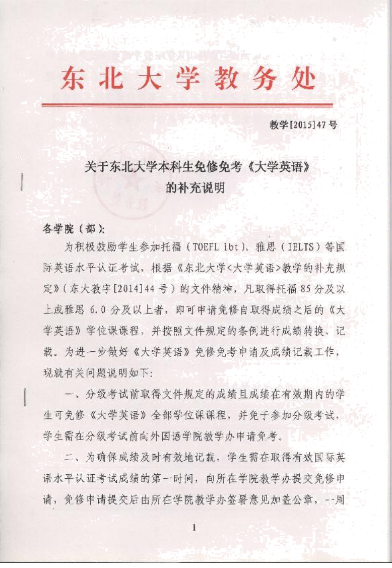 关于东北大学本科生免修免考《大学英语》的补充说明
