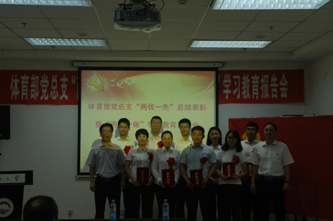 7月1日,体育部党总支在刘长春体育馆会议室举行 “两优一先”表彰,暨“两学一做”学习教育主题报告会,教师党员及学生党员共55人参加。会议由体育部党总支副书记诸善顺主持。