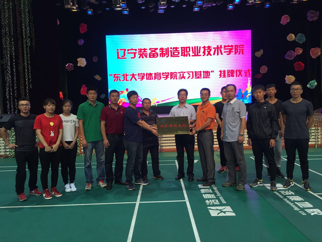 9月7日,体育部党总支书记张凤都、副主任陈家鸣、工会主席王景利、社会体育教研室主任回军、研究生教研室主任赵崇乐等一行5人来到辽宁装备职业技术学院参加辽宁装备制造职业技术学院“东北大学体育部实习基地”挂牌仪式。