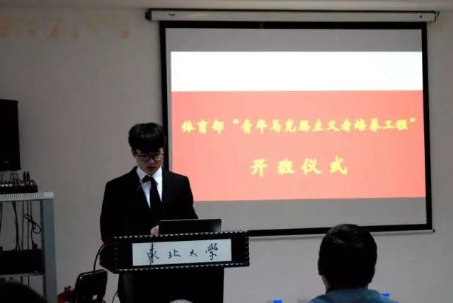 11月7日晚6:30,体育部团委于刘长春体育馆会议室召开“青年马克思主义者培养工程”开班仪式。体育部党总支书记张凤都、体育部副主任兼党总支副书记诸善顺、东北大学团委组宣部部长李瑞奇,体育部辅导员顾杰出席本次大会。体育部学生骨干、学生会全体成员参加。本次大会由体育部团委副书记张梦龙主持。