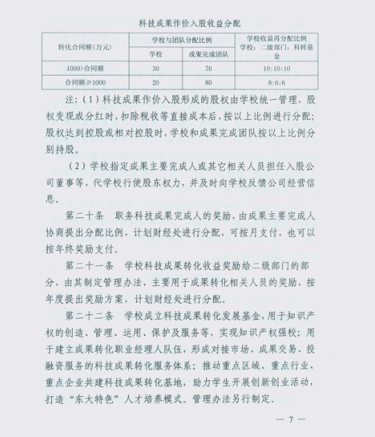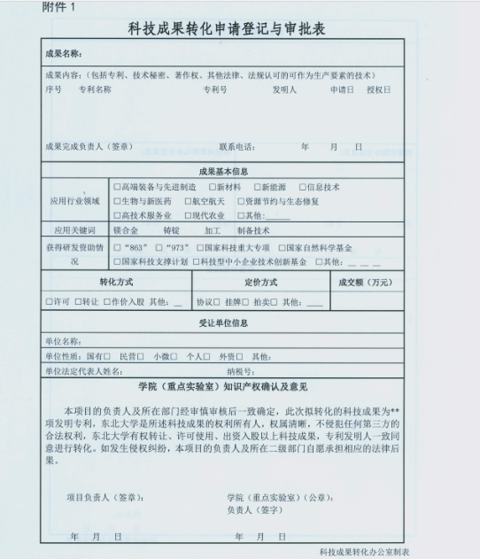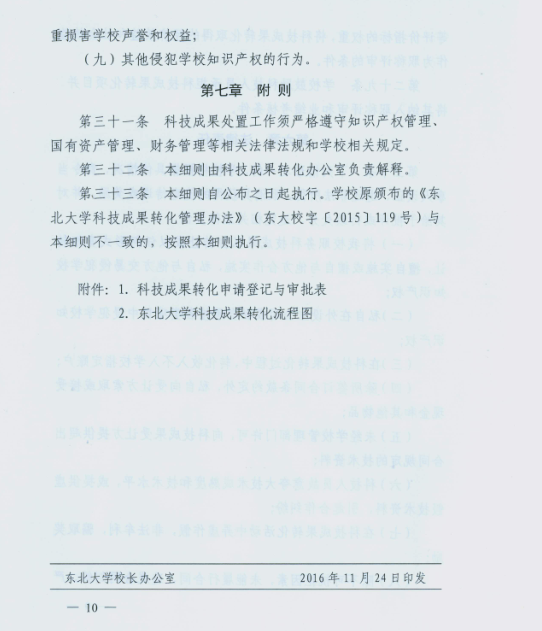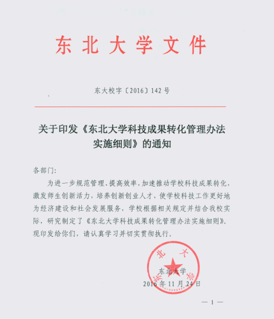 关于《东北大学科技成果转化管理办法实施细则》及《东北大学专利管理办法补充规定》文件印发的通知