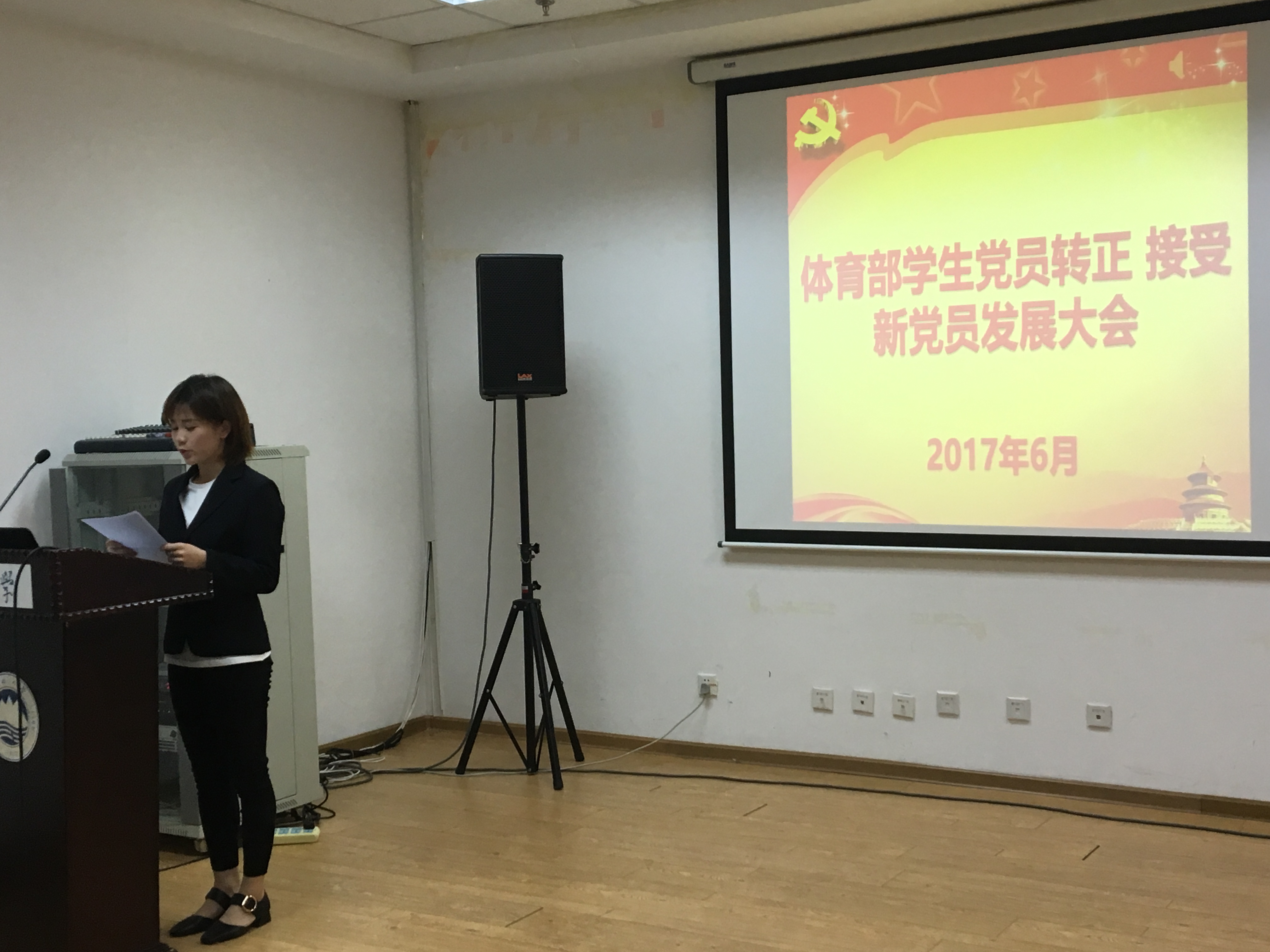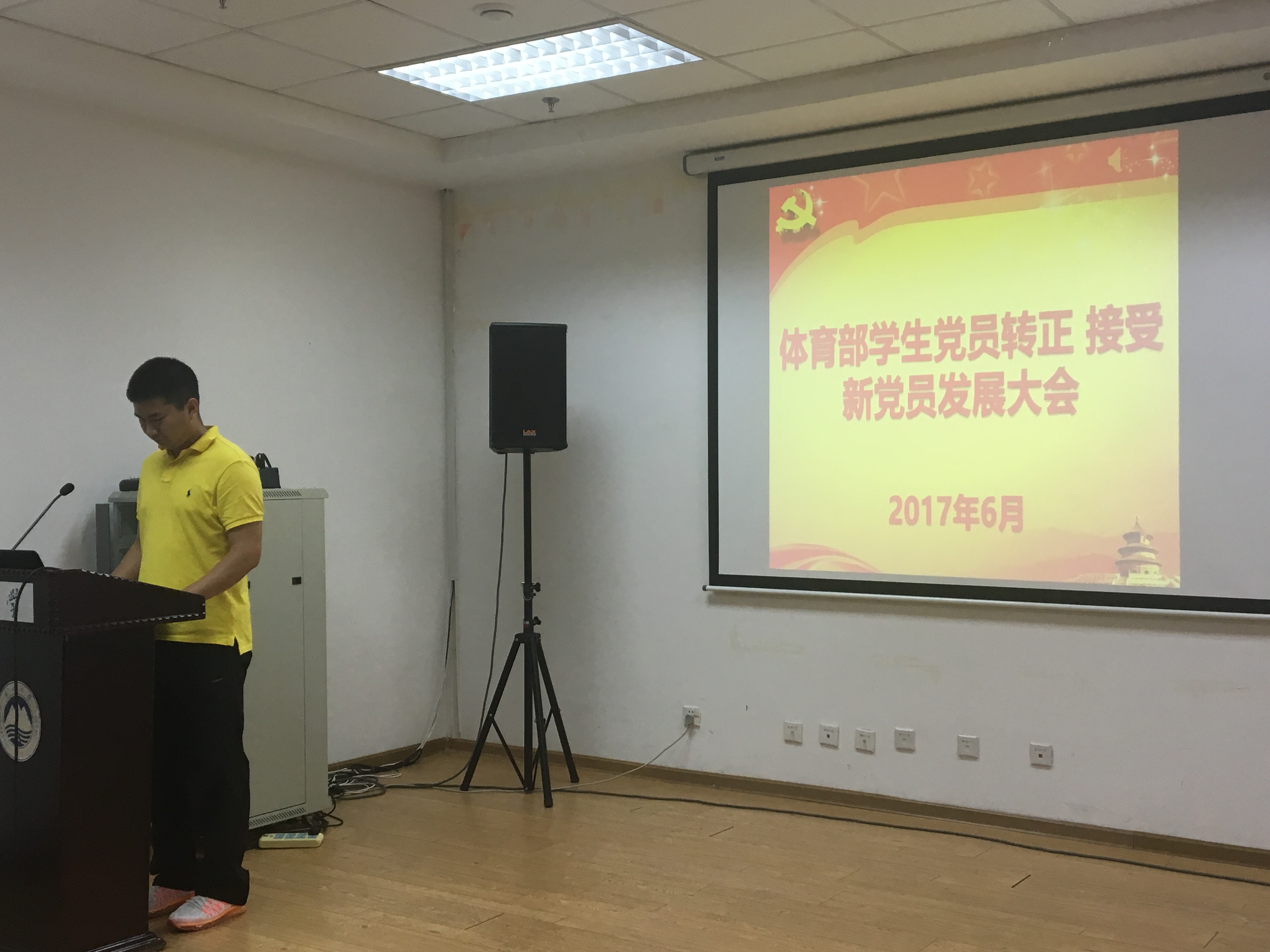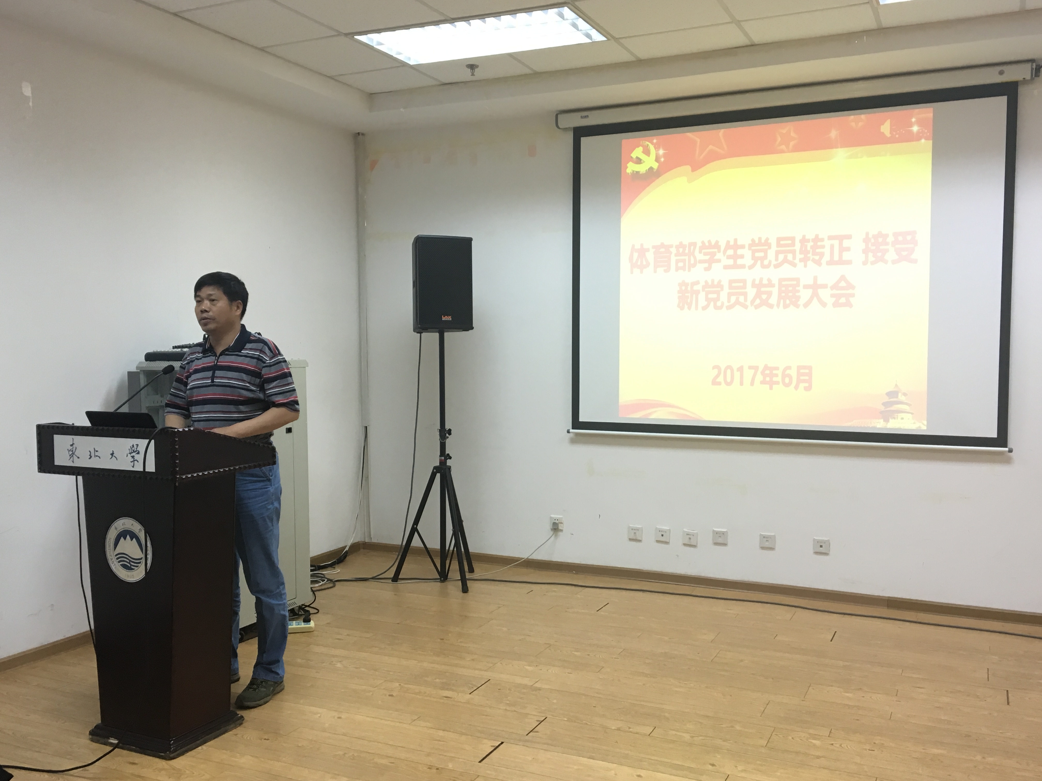 2017年6月7日,体育部学生党支部于刘长春会议室召开学生党员转正、接受新党员发展大会。本次大会由体育部学生党支部书记孙嘉铭主持,出席本次大会的有体育部党总支副书记诸善顺、组织委员贾新溪、17名学生党员(支部内学生党员共19名,其中2名党员因事未能参加)及若干名积极分子。