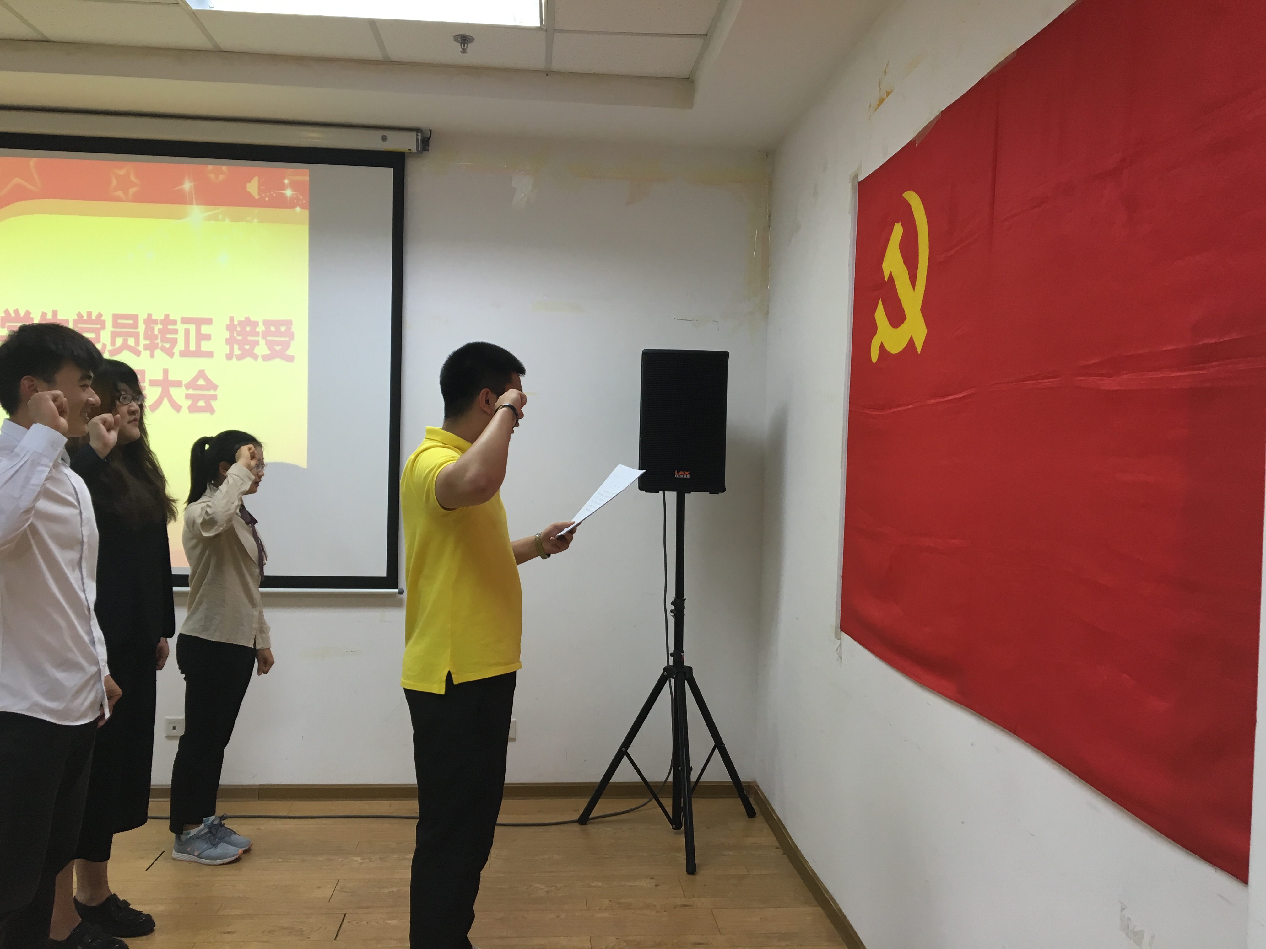 在党支部书记的主持下,大会在嘹亮的国歌声中开始。会上首先由入党积极分子潘一帆、崔美泽、周昊宣读《入党申请书》,三人的入党介绍人就其积极分子期间的思想、学习、工作等方面的表现进行评价,并指出了优点与不足。三位同志虚心接受了党员同志们的意见和建议,并表示在今后的时间里努力改正。经过全体党员无记名投票的方式,会上审议通过了三位同志的入党申请。