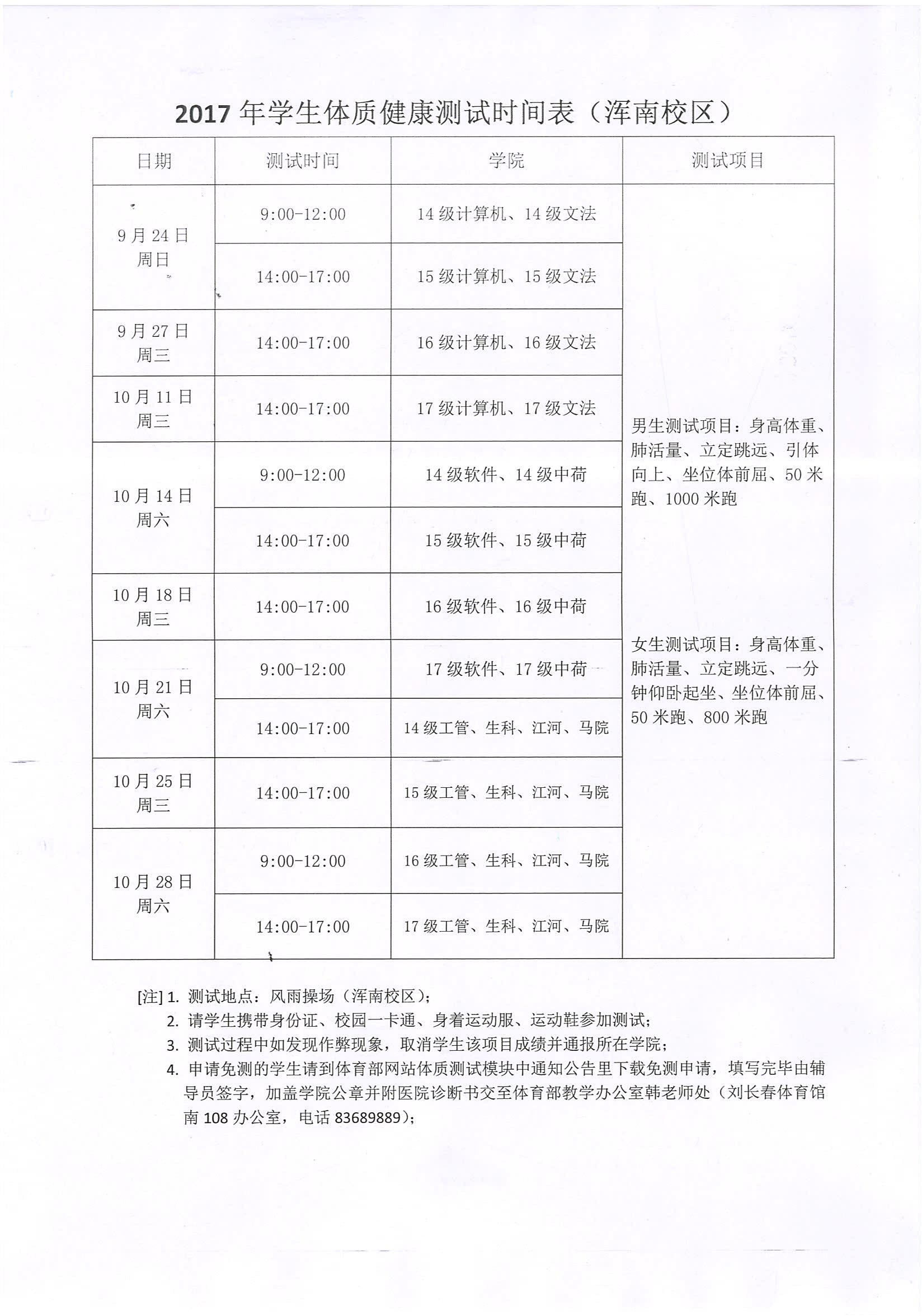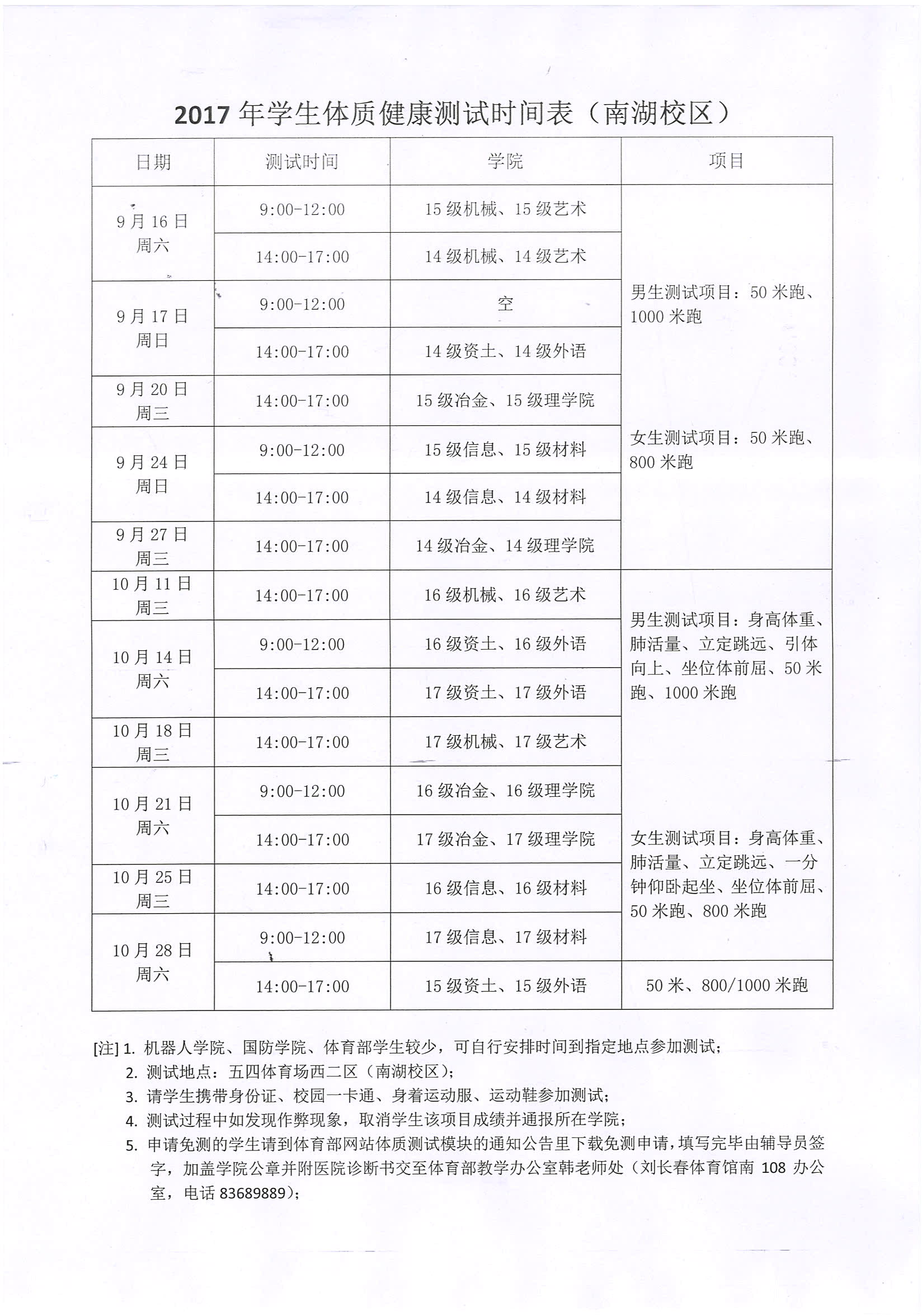 2017年下半年学生体质健康测试通知