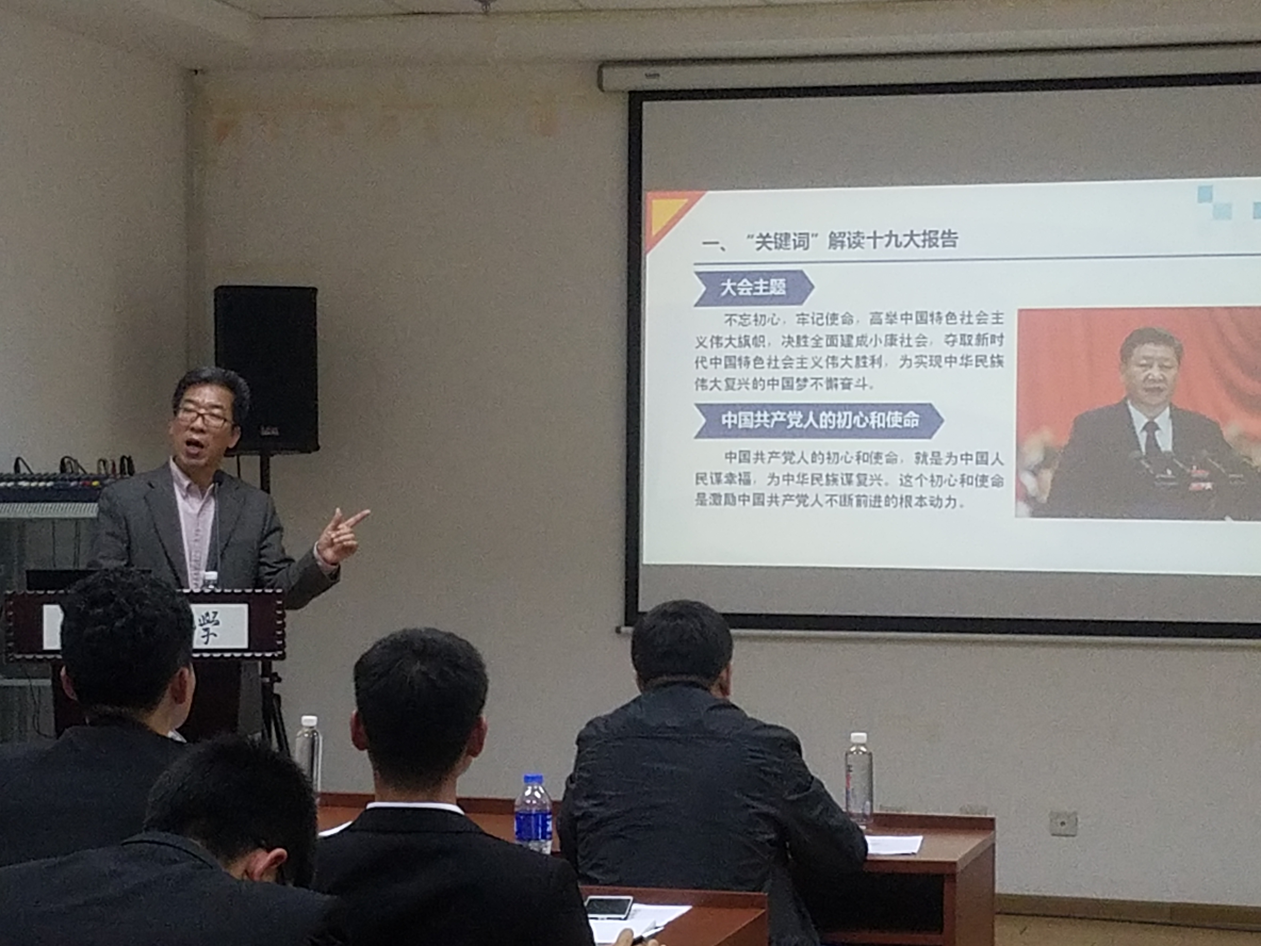 体育部党总支书记张凤都为青马学员上第一课。张凤都作了题为“学习贯彻十九大精神,做新时代有为的青年学生”主题报告,他从“关键词”解读十九大报告、十九大与教育事业、十九大与青年学生三个方面对十九大报告精神作了详细阐述。张凤都勉励全体学员深刻理解肩负的新时代历史使命,振奋精神,勤学苦练,勇做时代的弄潮儿,努力使自己成长为中国特色社会主义事业的合格建设者和可靠接班人。