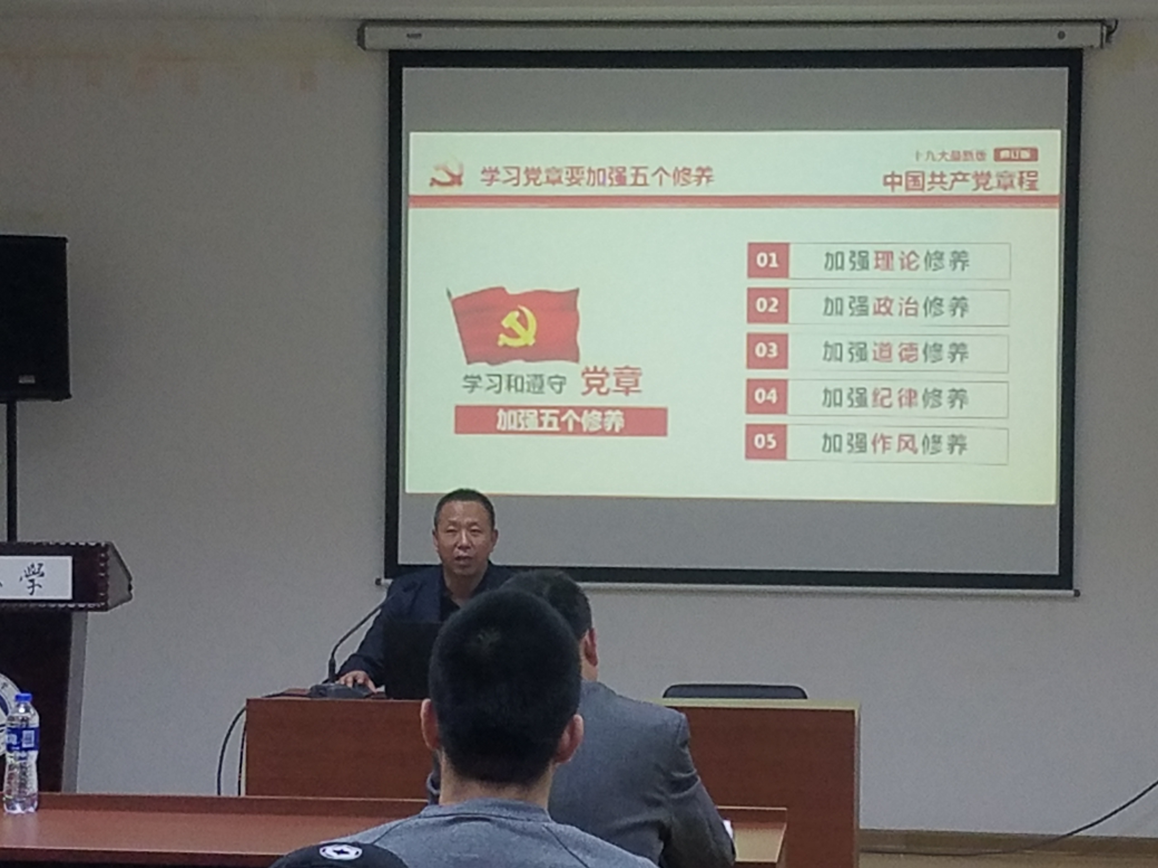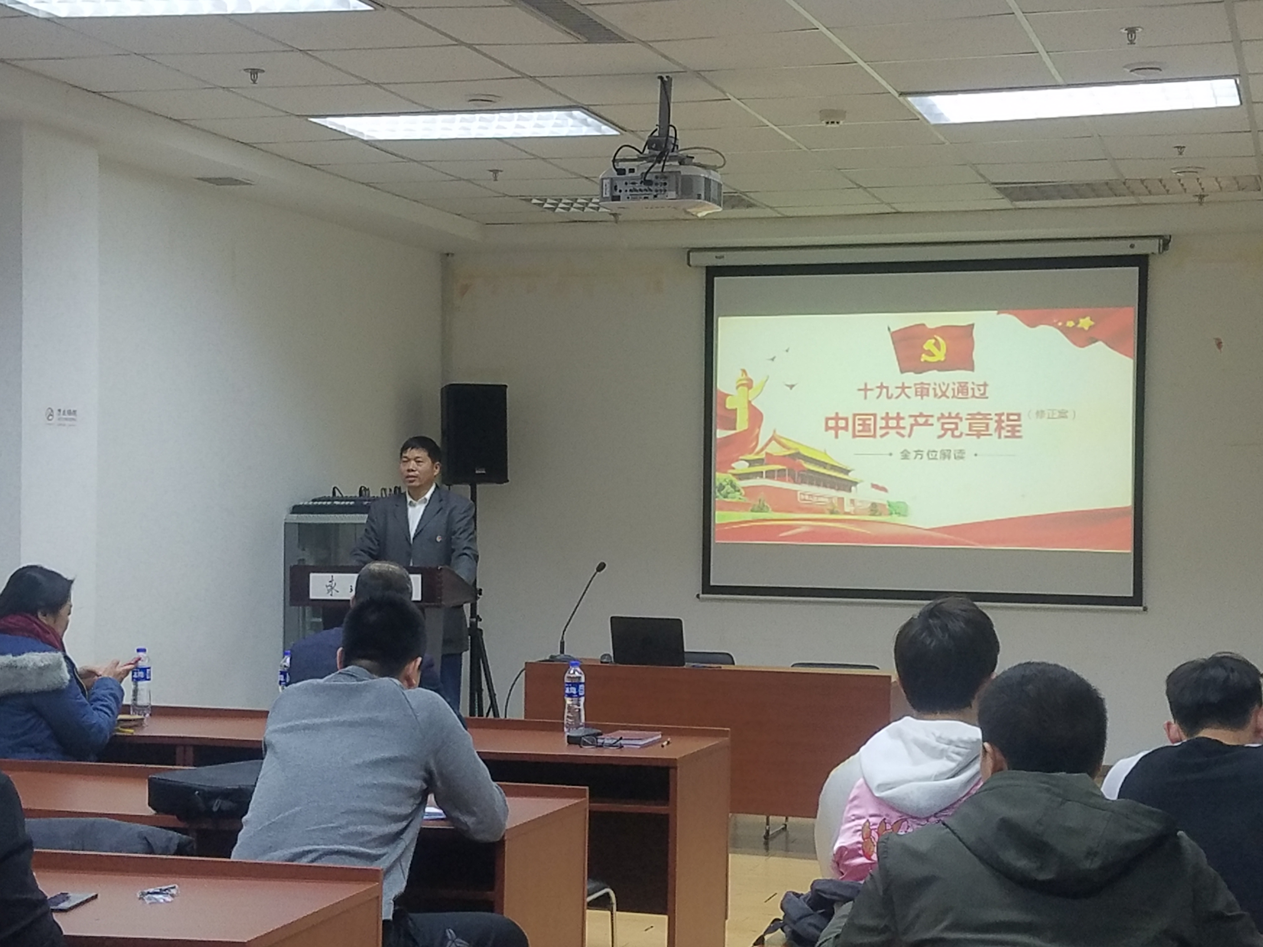 初青松围绕新时代中国特色社会主义思想,从党章的概述、党章的发展历程、党章的总纲、党章的条文和十九大对党章的修改等五个方面作了深刻解析,他指出,全体学生党员应时刻以一名优秀共产党员的标准来规范自身言行,抓住为人民服务这一本质,争做新时代中国特色社会主义的合格建设者和可靠接班人。