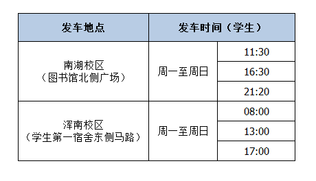 ● 南湖校区发往浑南校区中途停靠站点为:天润热力站、远洋天地站、长白大润发站、中海国际社区站、和平之门站、浑河国际城站。