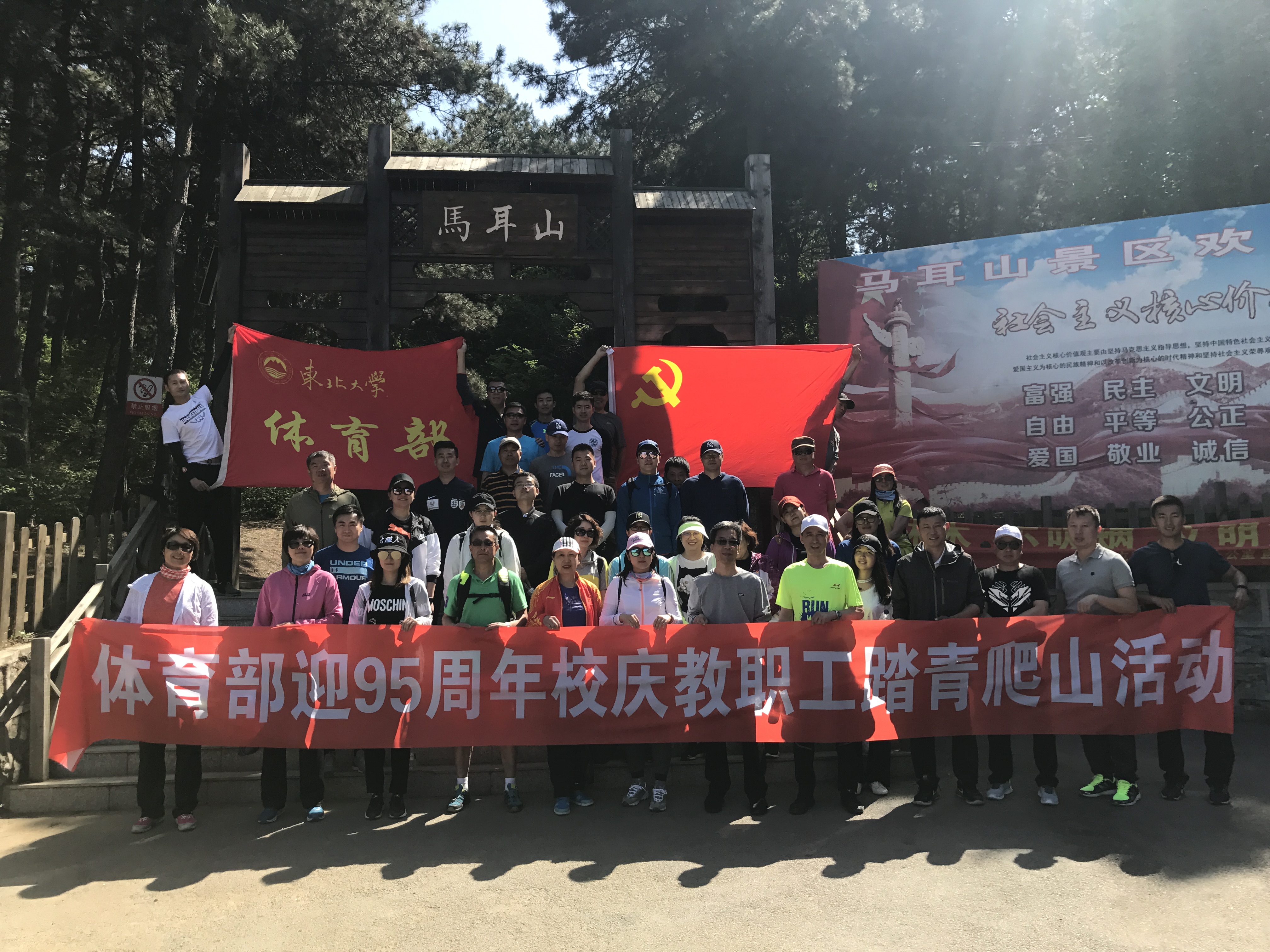 为迎接东北大学95周年校庆,弘扬东大体育精神,树立“健康工作,快乐生活”理念,丰富体育部文化生活,5月9日下午,体育部党总支联合工会共同策划组织体育部迎95周年校庆教职工踏青爬山活动,体育部、体育场馆管理中心共40余名教职工赴马耳山生态风景区开展活动,老师们热情洋溢,积极参与,共同感受春日沈阳的秀丽景色。