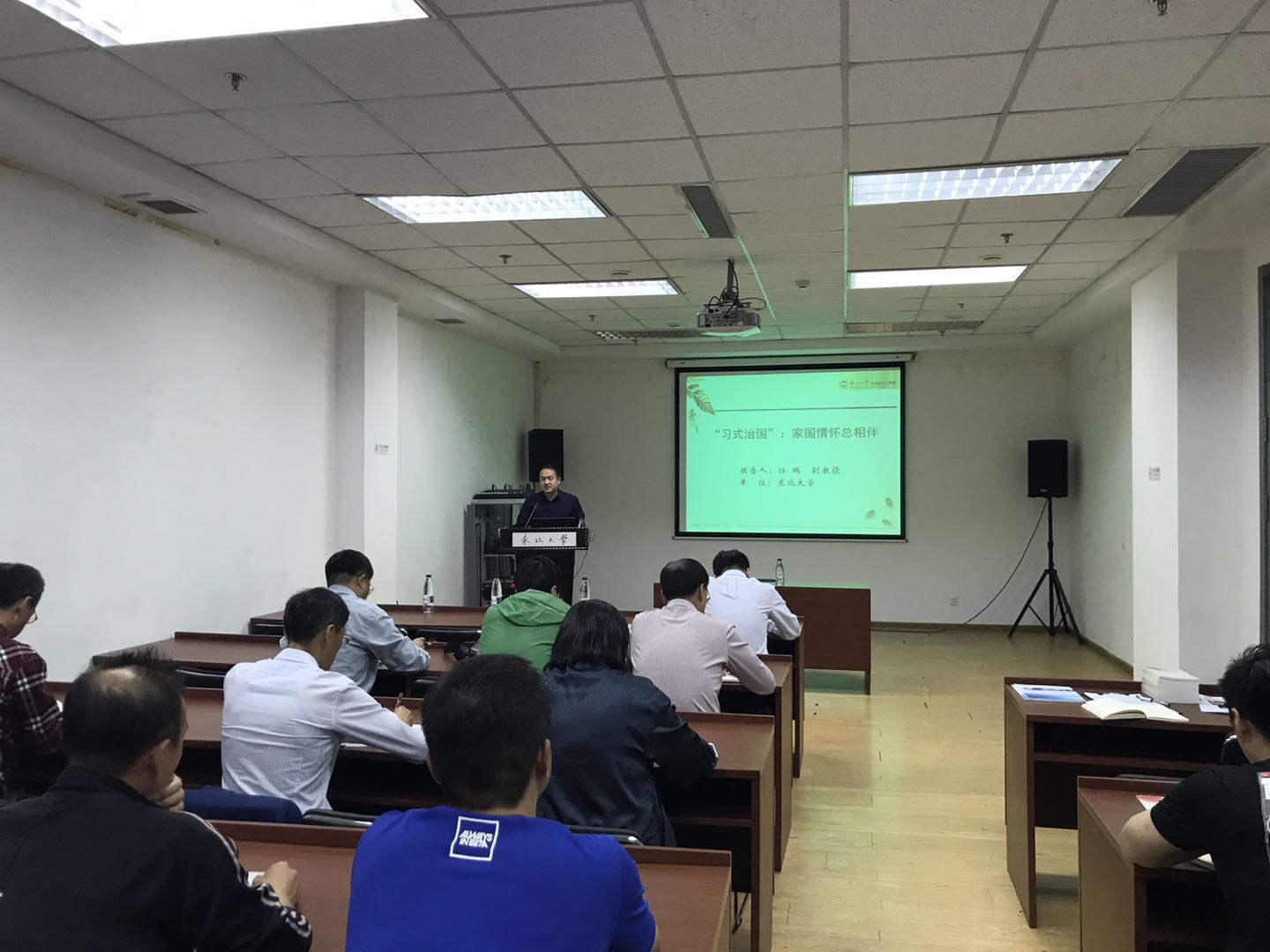 此次会议邀请马克思主义学院副院长任鹏副教授作了题为《“习式治国”:家国情怀总相伴》专题报告。任鹏以“总书记的家国观”为视角,从国之本在家、治国家先行、“爱国爱家”中国梦三个方面解读了习近平总书记的家国情怀,勉励全体师生树立正确的家国观念,形成爱国爱家、相亲相爱、向上向善、共建共享的社会主义家庭文明新风尚。