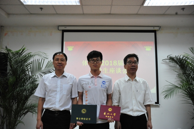 座谈会首先通过视频的方式回顾了2018届毕业生在体育部四年大学生活的点点滴滴。党总支书记张凤都和主任陈松分别为毕业生颁发毕业证书和学位证书并合影留念。张凤都宣布关于表彰体育部2018届本科毕业生潘一帆等八名同学的决定,并由教师代表分别颁发荣誉证书。