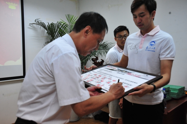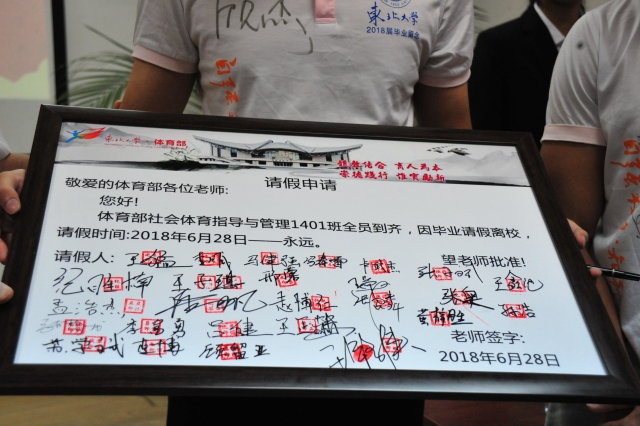 2018届毕业生向体育部赠送纪念品,并向体育部提交毕业假期申请,陈松主任代表体育部签字批准。