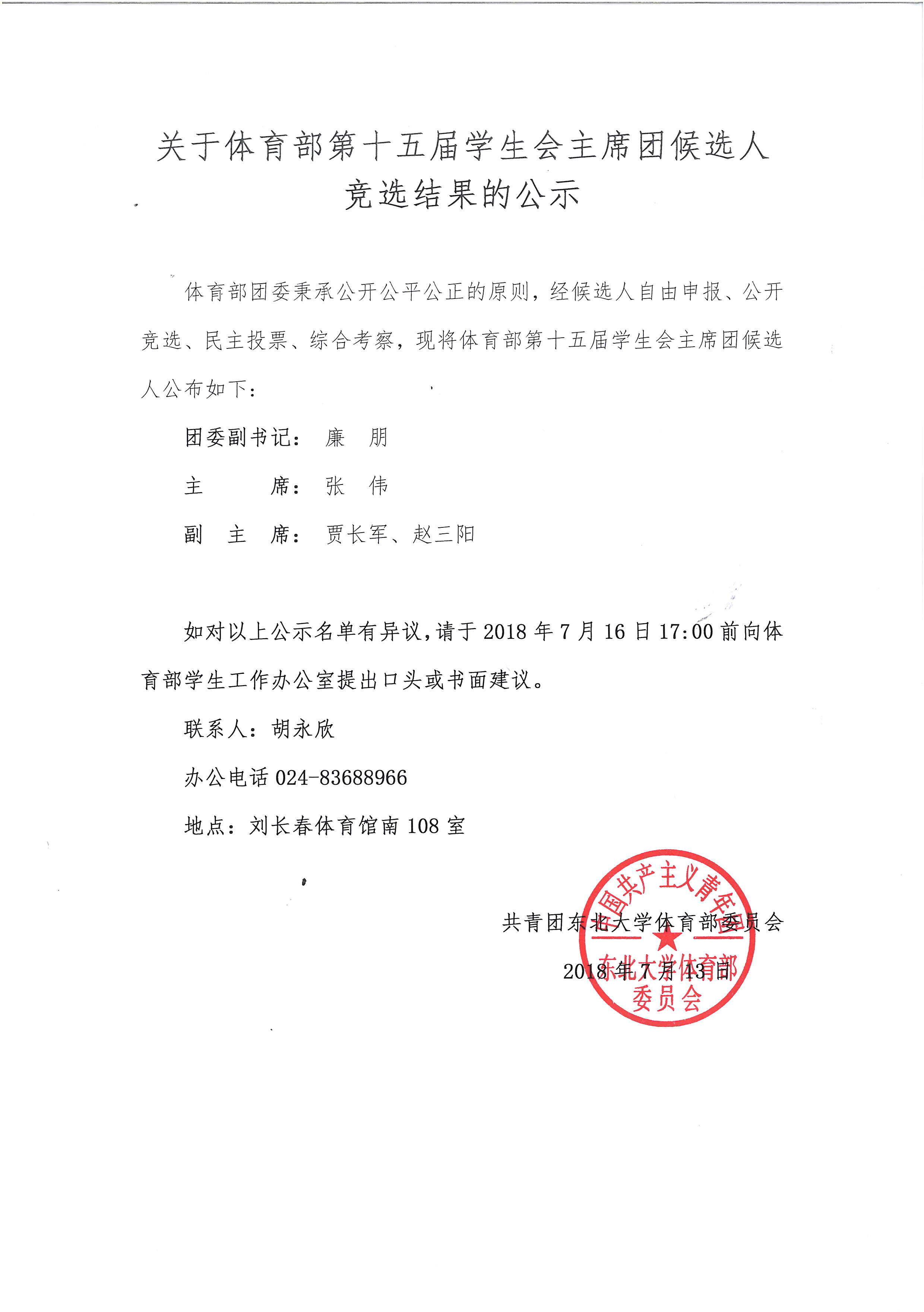 关于体育部第十五届学生会主席团候选人竞选结果的公示