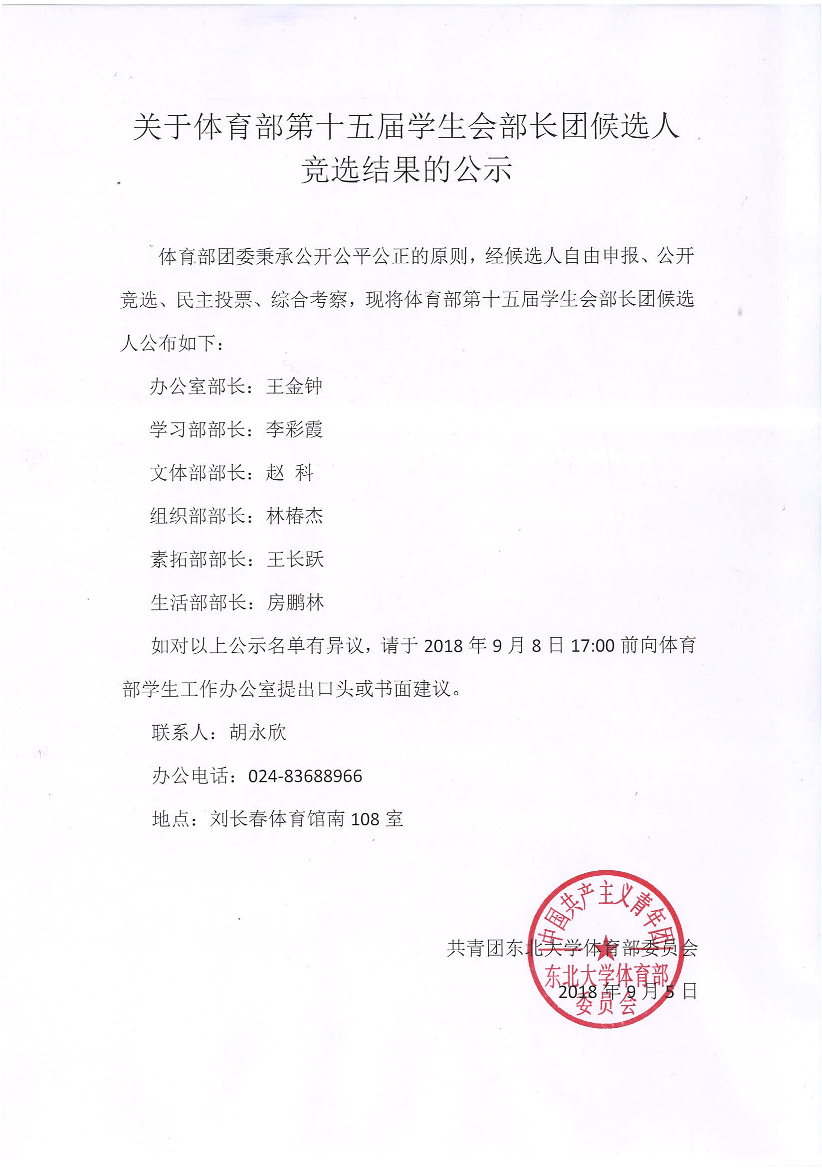 关于体育部第十五届学生会部长候选人竞选结果的公示