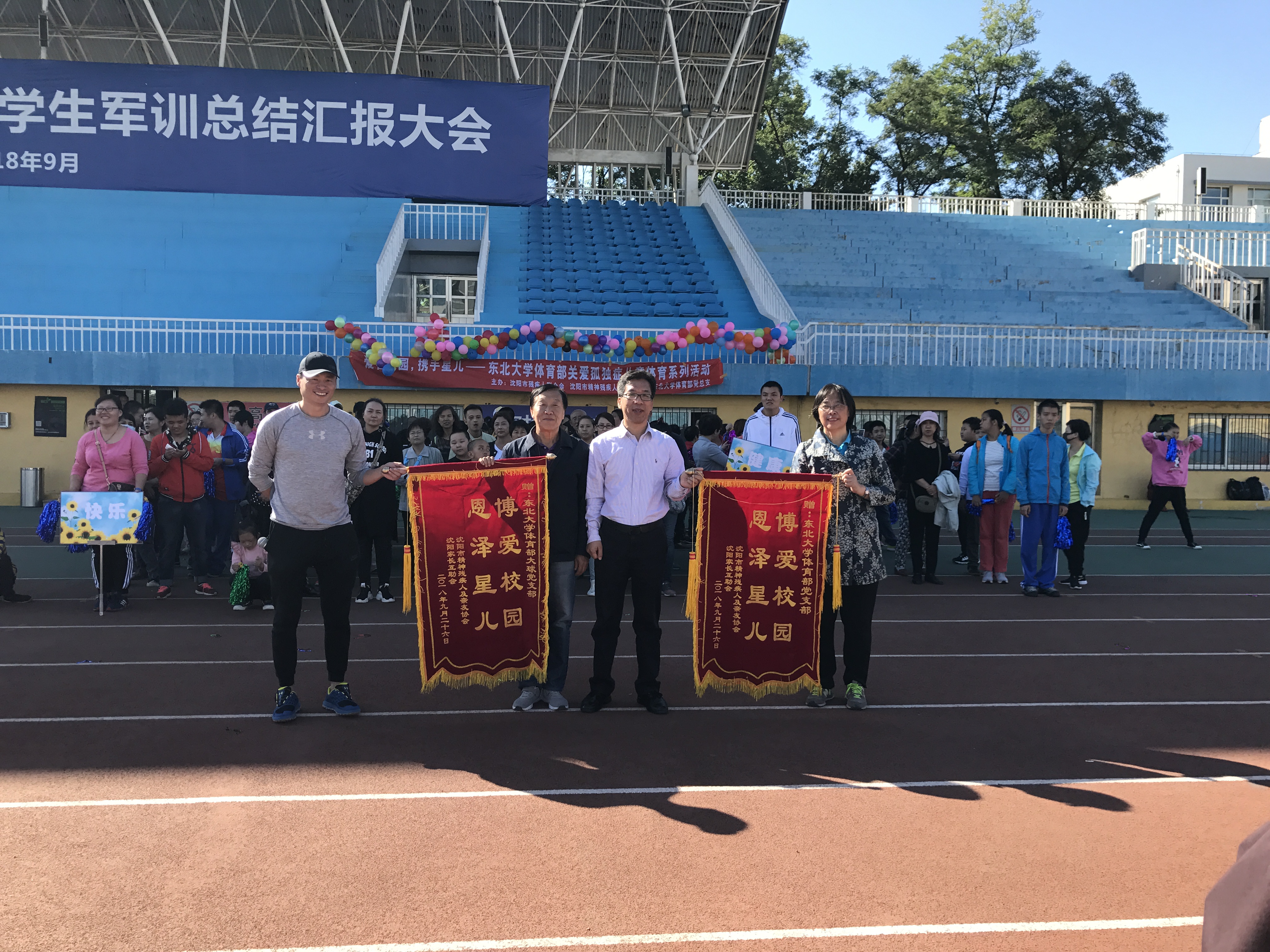 9月26日下午,体育部党总支联合沈阳市残疾人联合会、沈阳市精神残疾人及亲友协会共同开展“爱在校园,携手星儿——东北大学体育部关爱孤独症儿童体育系列活动”,沈阳市残联协会办处长侯良冶、沈阳市精神残疾人及亲友协会会长张晓军代表沈阳市精神残疾人及亲友协会和沈阳市家长互助会为东北大学体育部赠送锦旗。体育部党总支书记张凤都代表体育部对家长和孩子们的到来表示热烈的欢迎和诚挚的问候。