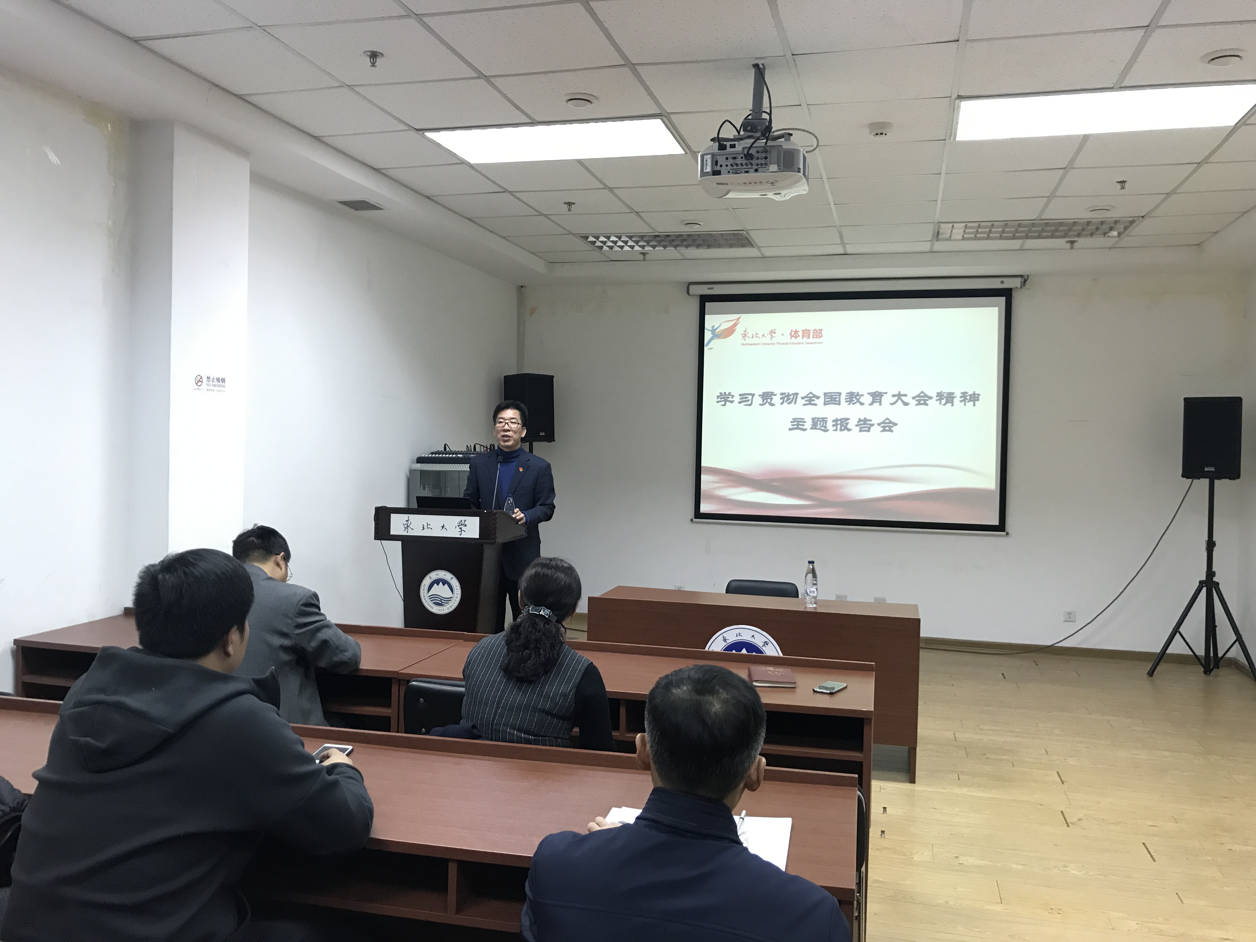 为深入学习贯彻全国教育大会精神,将师生思想和行动统一到教育大会精神上来,11月7日下午,体育部党总支在刘长春体育馆会议室召开理论学习中心组(扩大)会议,体育部全体教职工、体育场馆管理中心教职工党员、学生党员及积极分子参加会议,会议由体育部党总支书记张凤都主持。