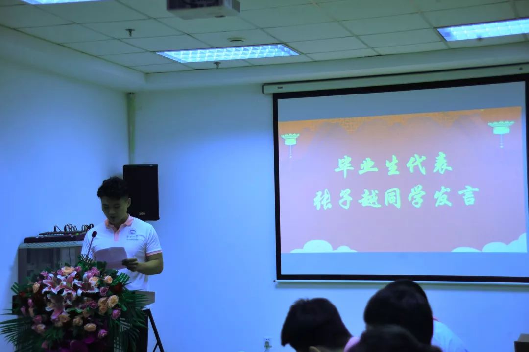 2019届毕业生代表张子越发言:他表达了毕业生对于母校四年栽培的感恩,对于各位老师辛苦教导的不舍,并在离别之际送上真挚祝福,祝福班级同学们前程似锦,祝福学弟学妹们学业有成,祝福老师们身体健康、工作顺利,祝福体育部的未来灿烂辉煌。