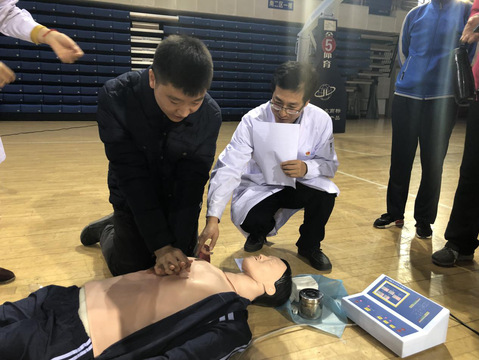 活动邀请校医院刘海宏主任进行急救知识培训,通过模拟演示,直观讲述了猝死救护事项和日常应急自救互救的知识与技能,师生们现场进行心肺复苏等实践操作。