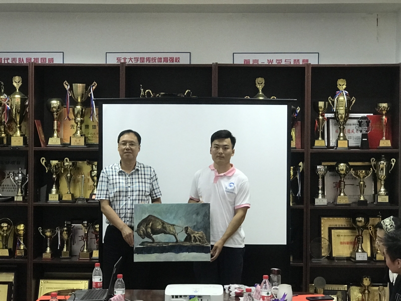 随后,2020届毕业生代表向体育部赠送纪念品,陈松代表体育部接收礼物。