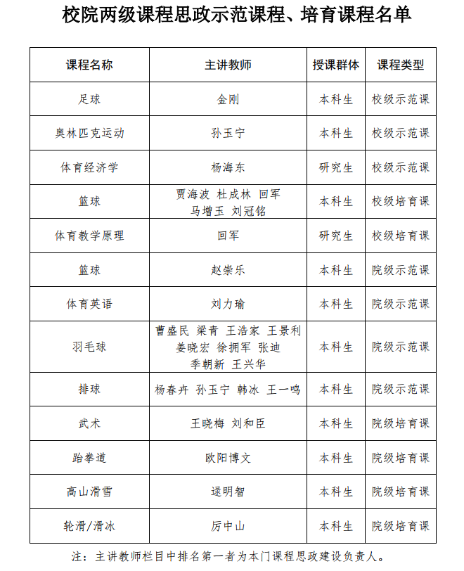 经自愿申报、体育部推荐、专家评审、学校课程思政工作领导小组讨论,确定《足球》等3门课程为东北大学第二批课程思政校级示范课程、《体育教学原理》等2门课程为课程思政校级培育课程。经体育部评审,确定《篮球》等4门课程为体育部第一批课程思政院级示范课程、《武术》等4门课程为院级培育课程。