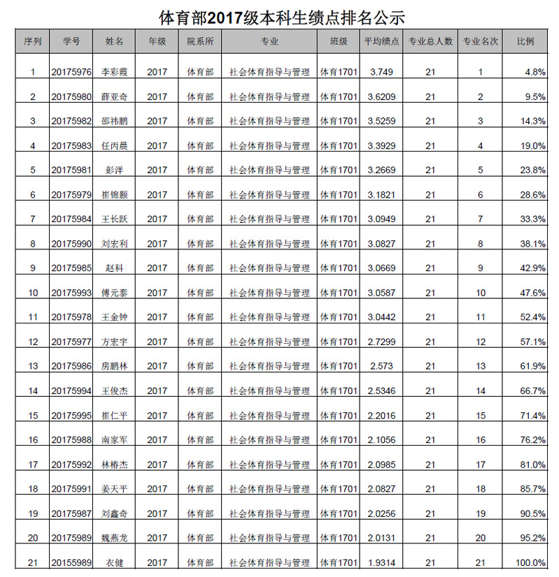 体育部2017级社会体育指导与管理专业绩点排名公示