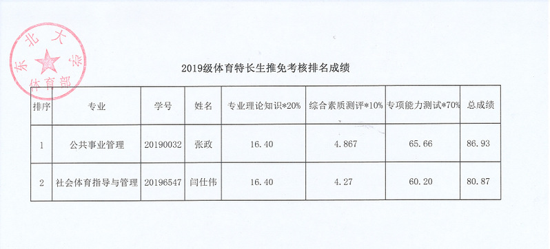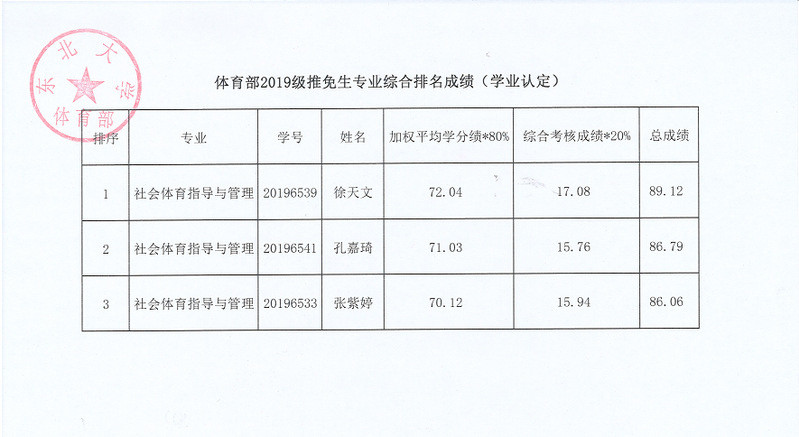 体育部2023届推荐优秀应届毕业生免试攻读研究生综合排名成绩公示